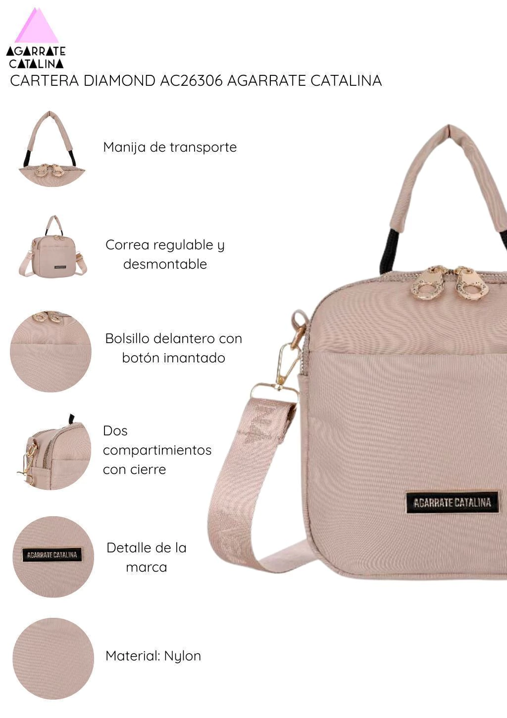 La Cartera Diamond AC26306 de Agarrate Catalina está diseñada para combinar funcionalidad y elegancia en un formato compacto, es perfecta para el uso diario gracias a su distribución práctica y detalles modernos.