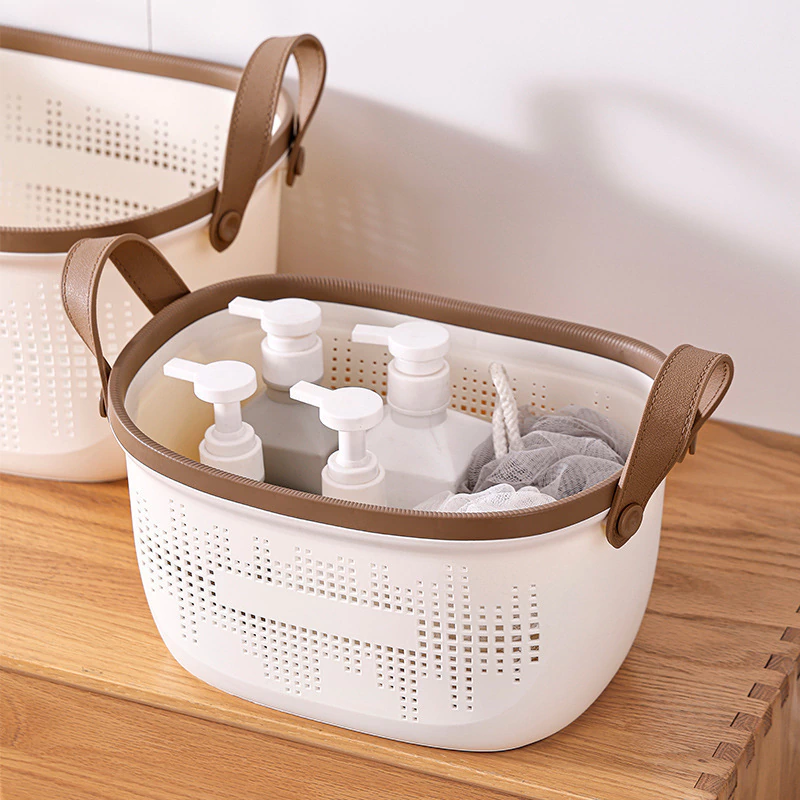 (Cesto organizador grande con diseño minimalista, posee asas de goma y un sistema de ventilación para evitar la humedad. Ideal para ropa, artículos de limpieza, articulos de cocina, entre otros).