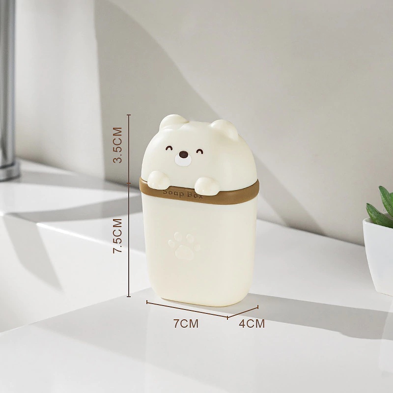 Cada jabonera con un diseño compacto en forma de osito. Incluye una bandeja de drenaje, un compartimento para jabón y una tapa. Vienen 3 modelos diferentes a elección. Ideal para viajes
