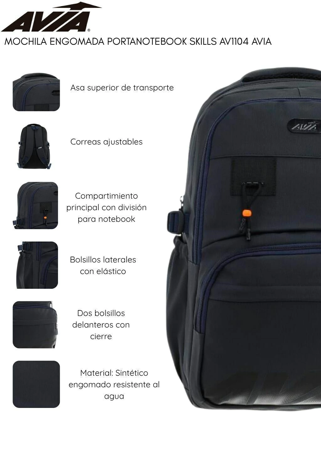 La Mochila Engomada Portanotebook Skills AV1104 de Avia está diseñada para brindar resistencia, estilo y funcionalidad, esta mochila es ideal para el uso diario, viajes o actividades al aire libre, gracias a su material impermeable y gran capacidad de organización.
