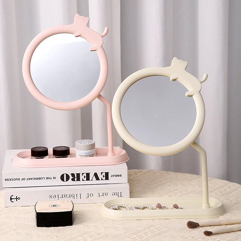 con una base multiuso y un espejo circular con un diseño de gatito en un lateral. Ideal para maquillaje, bijouterie, accesorios para el cabello, etc