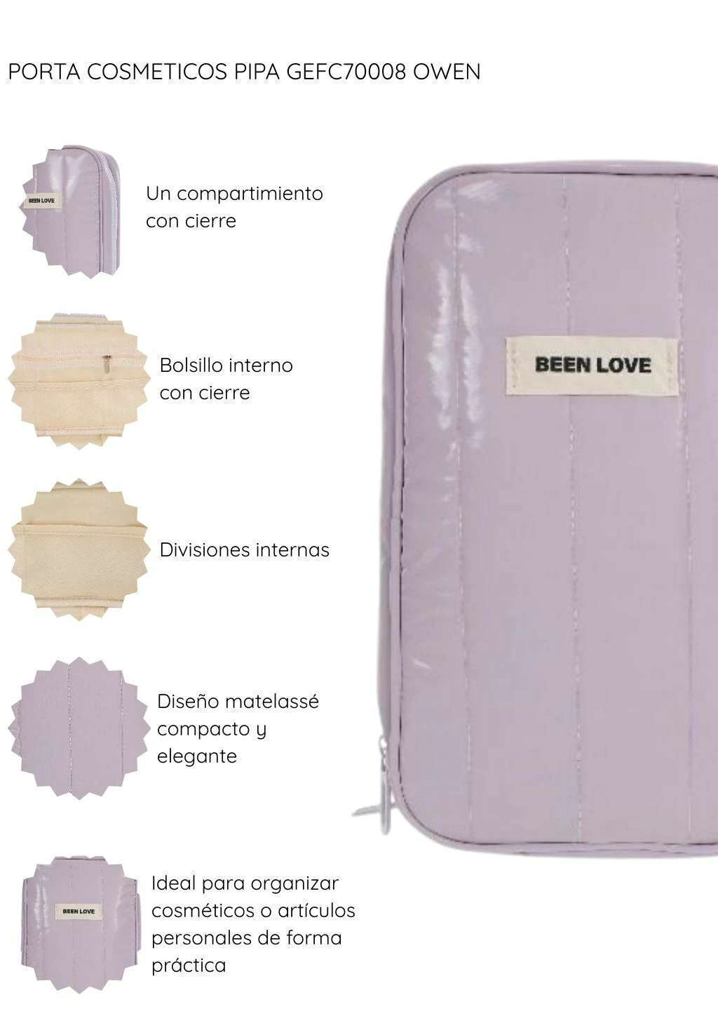 El Porta Cosméticos Pipa GEFC70008 de Owen destaca por su diseño matelassé con compartimientos funcionales, es ideal para organizar tus cosméticos o artículos personales con estilo y practicidad.